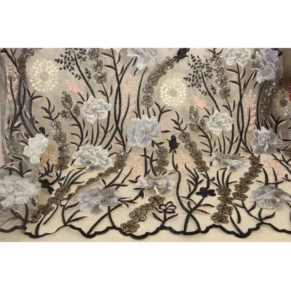 This elaborate all over embroidery lace decorate with petit round black/gold sequins and muticolored embroidery for floral ornament elements. Sumptuously decorated embroidered lace represents the glitz and glamour of nightdress fabrics in their couture segment. Your dream dress can have it all: sequins, beads and sparkling rhinestones. To keep it light and simple go for soft and smooth satin stitch embroidery with a spectacular 3D floral pattern.