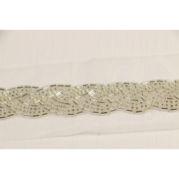 This white tulle trim is embroidered with myriads of glass beads and bugles, carefully attached one by one to the delicate ground. sparkling crystals run strings of glass tube bugles, arranged in a grid-and-braided pattern. This high quality trim is a sure way to bring festivity to your apparel. Accentuate your waist, sleeves and hems and add some sweet weight to your lightweight fabrics, Fold the tulle edges under for a slim, sparkly belt. Beaded motif is 2.5cm wide, and mesh extends 1.7 cm on either side.